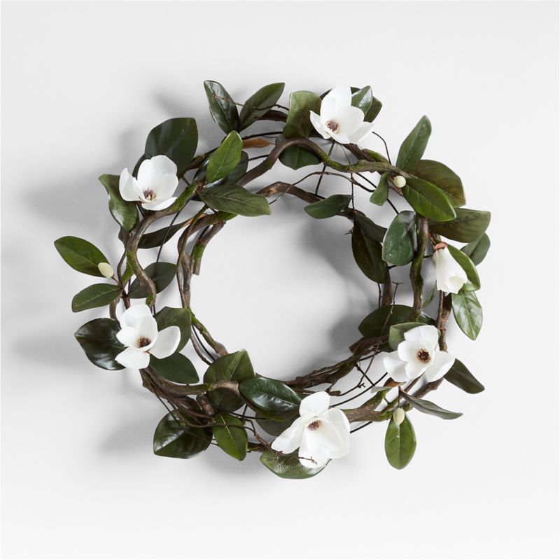 Modern yet sweetly charming, our faux magnolia wreath weaves an open ring of vines supporting glossy green leaves and lush, waxy blooms. The naturalistic wreath captures the fleeting beauty of spring in a fresh palette. Luxe, life-like and unparalleled in quality, our faux wreath adds seasonal style above a fireplace, on an inside door or encircling a flameless candle as a dining table centerpiece.