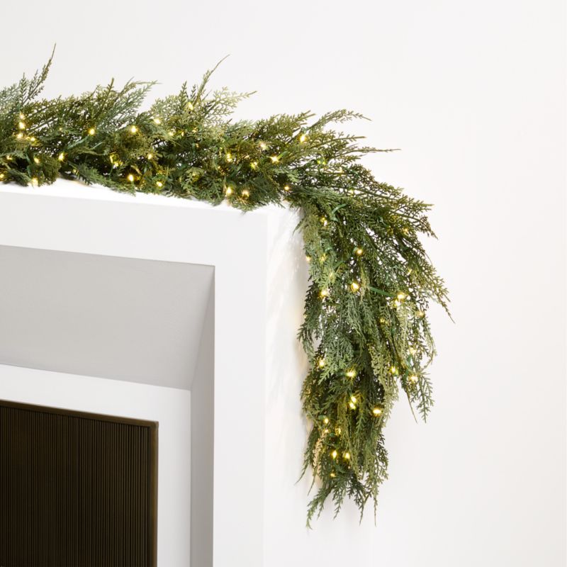 Our pre-lit garland graces the home with the lifelike greenery. Skillfully crafted to look just like real botanicals, the lush length replicates the soft, feathery appearance of hemlock boughs. Lit with warm white LED lights, the garland brings nature's beauty to your seasonal decor.