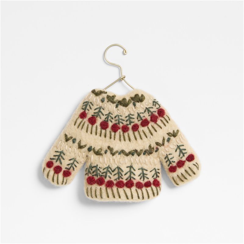 Cozy up your Christmas tree with these irresistibly snuggly sweater ornaments. Crafted of creamy felted wool, the sweater is sewn by hand with a wintry Fair Isle pattern in green and red. As a final touch of charm, each sweater is hung on a teeny gracefully looped metal hanger finished in gold. Our exclusive ornament makes a delightful package topper (especially for the gift of a sweater).