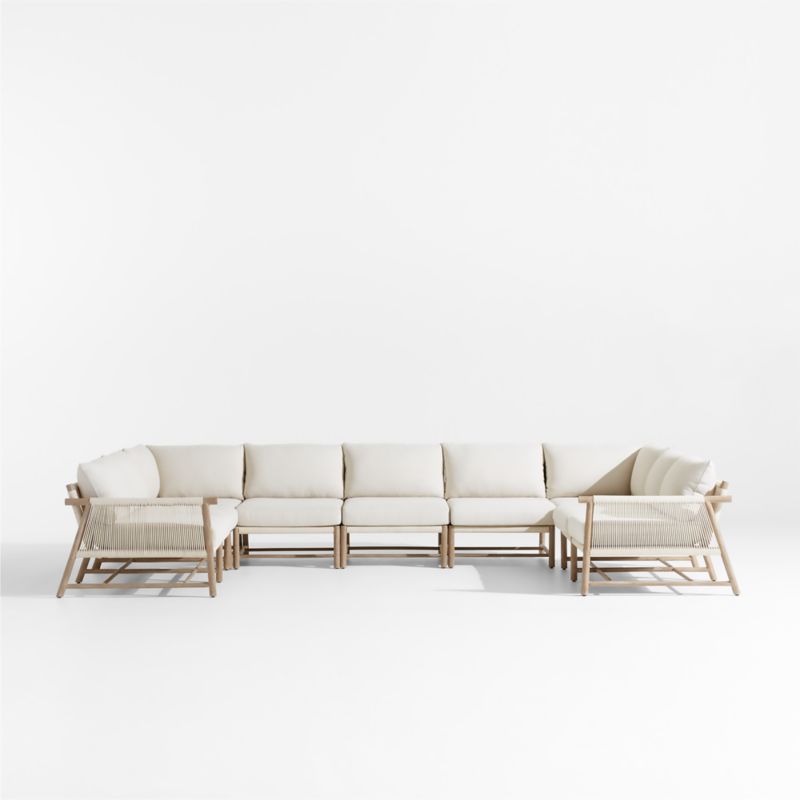As cool and coastal as an ocean breeze, Fen brings effortless style to outdoor sectional seating. Comprising two corners, three armless chairs and left- and right-arm loveseats, the U-shaped sectional is designed with medium-firm seats and soft backs for a look that straddles casual and formal. Round dowels of natural teak craft the clean-lined frames, highlighted with wirebrushing and a warm ceruse finish. Each piece is hand-wrapped by skilled artisans with an outdoor-rated cord that looks and feels like natural rope. Adding eye-catching texture and a tonal complement, the ivory-colored cord wraps striking linear accents on the arms and creates a basketweave foundation for box seat cushions and pillow backs covered in white fabric.