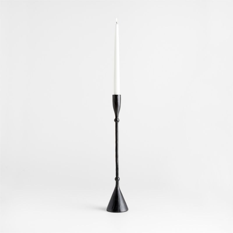 Ferric updates antique cast iron candlesticks with an impeccable blend of modern and vintage style. Dramatically tall and slender, our medium taper holder shapes black-finished metal with rustic geometry and texture. Group multiple heights of candle holders from our Ferric collection for a graceful arrangement on your fireplace mantel, dining table or sideboard.