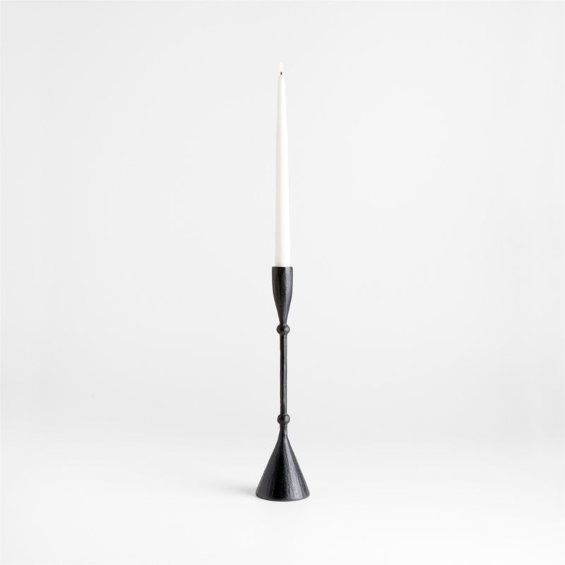 Ferric updates antique cast iron candlesticks with an impeccable balance of modern and vintage style. Dramatically elongated and slender, our small taper holder shapes black-finished metal with rustic geometry and texture. Group multiple heights of candle holders from our Ferric collection for a graceful arrangement on your fireplace mantel, dining table or sideboard.