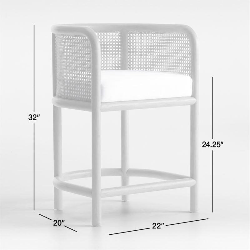 Classic bentwood and retro caning shape the breezy curves of our Fields counter stool. Made of solid oak and rattan, the seamless design integrates back, armrest and legs into one fluid silhouette. Upholstered in white to complement the natural frame, the seat cushion snuggles in for a comfy yet upright sit. The Fields cane counter stool is a Crate & Barrel exclusive.