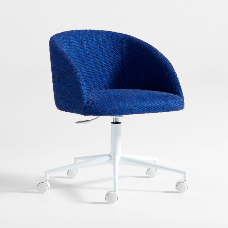Brighten up study time with our modern kids desk chair that goes up, down and all around. Upholstered in a cobalt blue bouclé fabric flecked with black, the barrel-shaped chair sits soft and cozy, and swivels 360 degrees. Five caster wheels on a white star base travel smoothly over wood, carpet or an area rug. Comfortable yet supportive, the desk chair adjusts in height making it perfect for study sessions, craft time or game breaks.