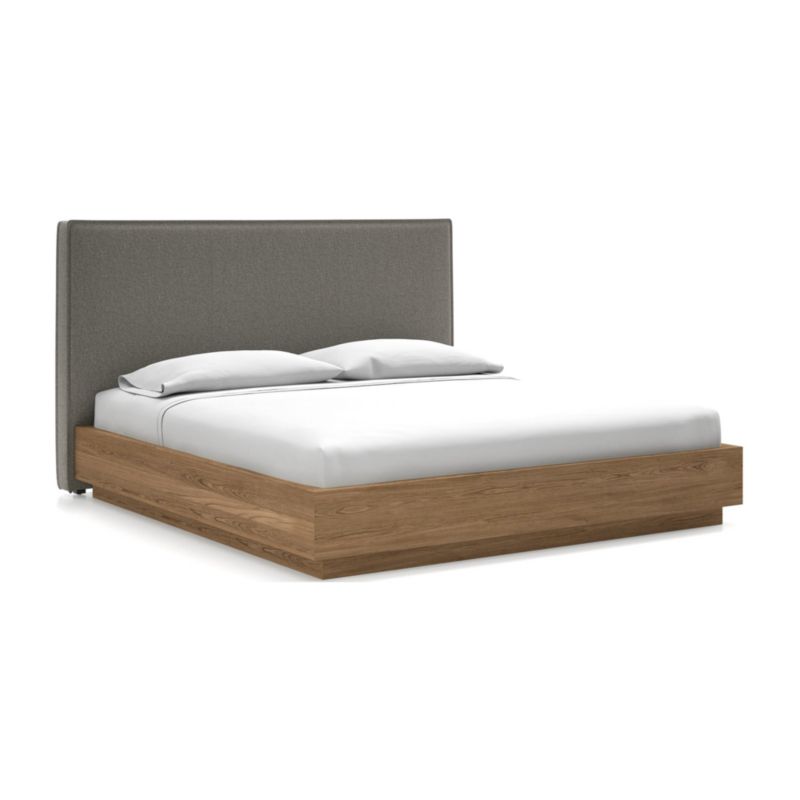 Fresh flanged edges and subtle seaming tailor our Flange headboard for the modern bedroom. Upholstered in fabric or fool-the-eye faux leather, the king headboard pairs up beautifully with our Batten king bed. Simply styled with a plinth base, the bed showcases the lively grain of oak veneer with a smoky grey finish. The Batten bed is designed for us exclusively by Bill Eastburn of William Eastburn Design.