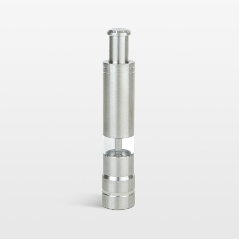 This delightfully petite mill grinds salt or pepper with just one finger. Crafted of stainless steel, the grinder looks sleek and modern on your table, next to the stove, on a picnic or at a campsite. The clear window lets you keep an eye on your seasoning supply, and the one-handed pump action makes the compact mill easy to use no matter where you're cooking and feasting.