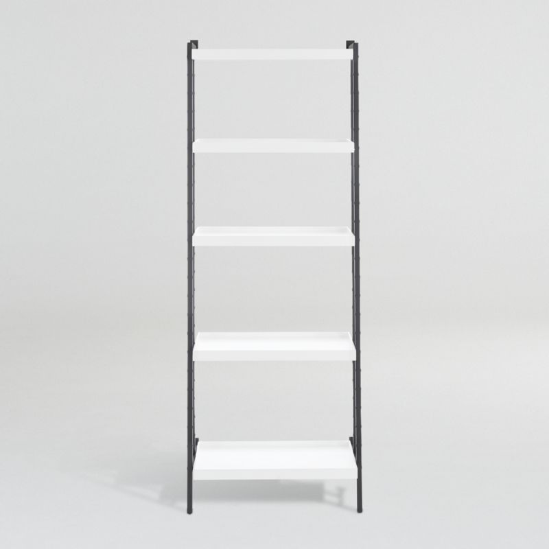 Flex brings contemporary design to household storage, scaling up or down to suit your space. Five white tray-like shelves join black iron uprights that anchor to the wall to fashion a clean-lined bookcase. Designed by Paul Galli, this space-saving bookcase is perfect for shelving books in the office, shoes and handbags in a walk-in closet, or general storage with a compact footprint in apartments or small rooms. Flex Modular 24" 5-Shelf Half Bookcase is a Crate and Barrel exclusive.