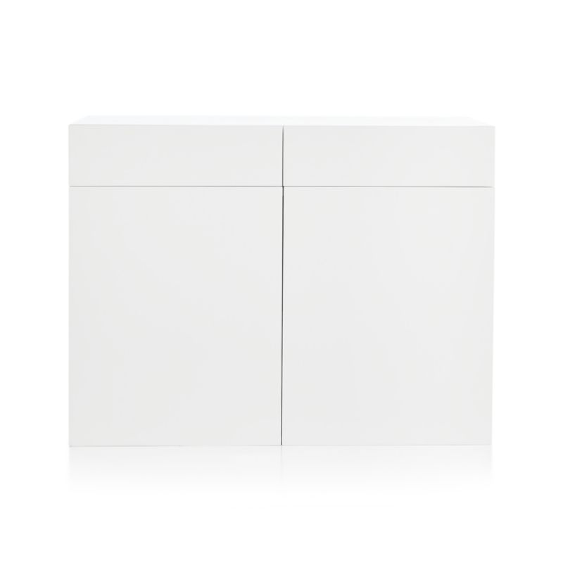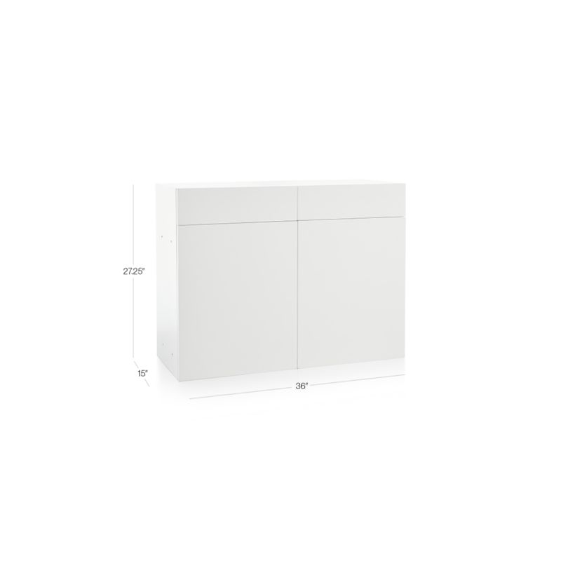 Flex brings contemporary design to household storage. Using black iron uprights and sleek white storage compartments that stack vertically, the modular system scales up or down to suit your space. The perfect solution for closet, office or entryway storage, this streamlined cube of a cabinet provides ample space for storage with two drawers and a roomy interior with an adjustable shelf. The cabinet anchors between two Flex uprights (sold separately) to provide additional storage with a space-saving footprint. Designed by Paul Galli, the Flex Modular Storage Closed Cabinet is a Crate and Barrel exclusive