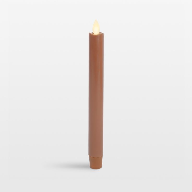 Our flameless candle fools the eye with its lifelike flickering, warm glow and charming faux flame dancing atop a real wax taper. Safe and mess-free, the battery-powered taper candle in warm caramel brown creates atmosphere and gentle illumination on the dining table or mixed in with a floral arrangement. Use the automatic on-off timer to enjoy five hours of delightful and worry-free candlelight.