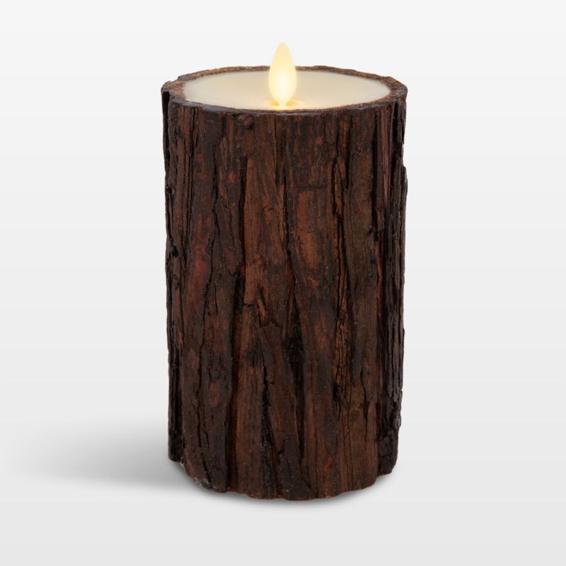 Our flameless candle fools the eye with its lifelike flickering, warm glow and charming faux flame dancing atop a wax candle wrapped in real wood. Made of paraffin encased in bark-textured wood, the pillar candle is battery operated for safe and mess-free illumination. Use the automatic timer to enjoy five hours of delightful and worry-free candlelight.