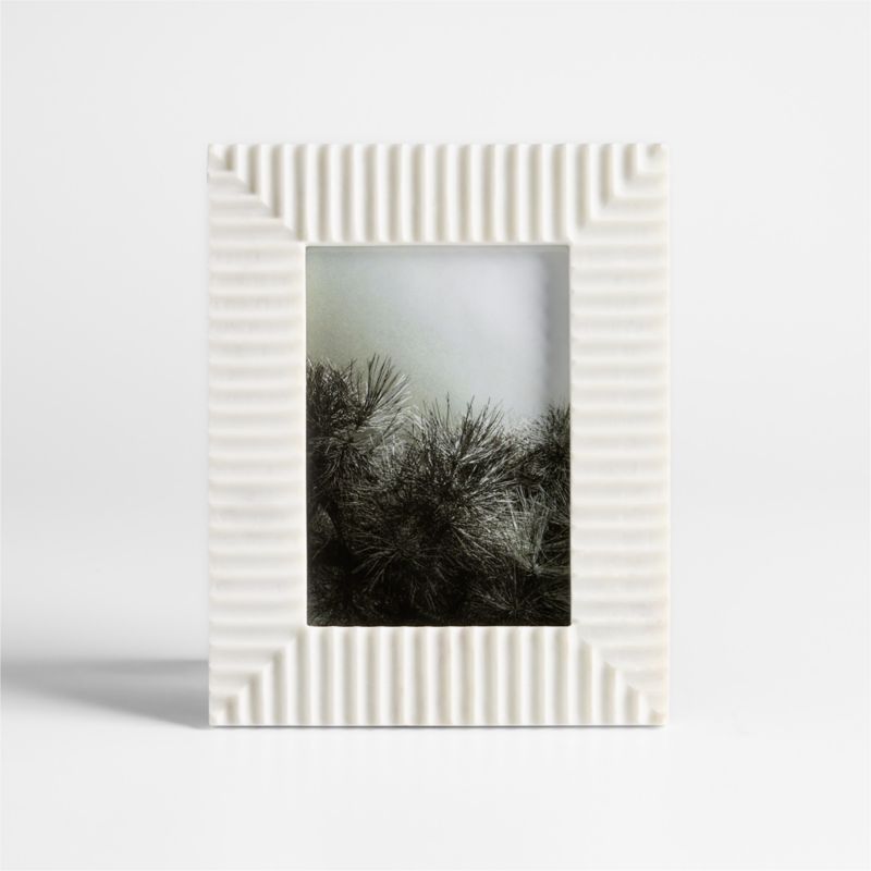 This delightful frame puts the focus on your favorite photo. Made of gorgeous white marble, the frame is carved by hand with bold ribbing that optically animates the featured image. The small frame is perfect for display on a bookshelf, desk or vanity table.