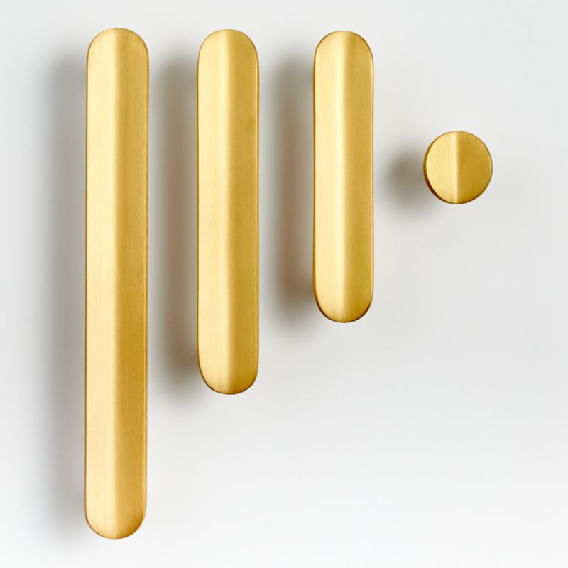 Update your kitchen or bathroom cabinetry, or give a quick refresh to a favorite piece of furniture with our striking Fold hardware. Featuring a subtly creased design and the golden glow of brass, the easily installed oblong handles and round knob provide an instant update to painted or wood cabinets and drawers. The pull handles mount horizontally or vertically.