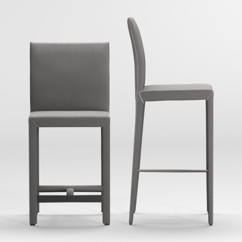 Pull up to the bar on our sleek, comfortable stool with reinterpreted Italian design inspiration, clean Parsons-style lines and luxe leather upholstery. Fully wrapped in top-grain leather in dark grey, the Folio bar stool is finished with neat mitered corners, flange seaming and stitched construction that have helped make it a customer favorite.