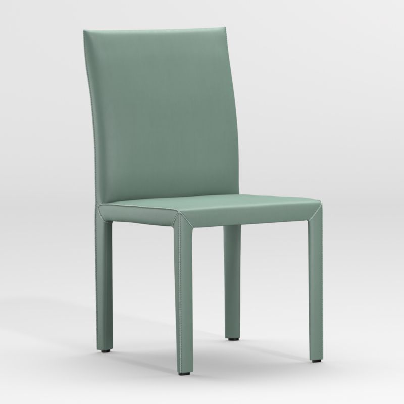 With clean, Parsons-style lines wrapped in luxe green leather, our Folio side chair reinvents classic Italian design with comfort in mind. Top-grain, semi-aniline leather covers a steel and wood frame and inviting foam-cushioned seat. Attention-getting details such as neat mitered corners, flange seaming and stitched construction, accentuate the side chair's well-groomed looks, helping make it a customer favorite. The Folio Top-Grain Leather Dining Chair is a Crate and Barrel exclusive.