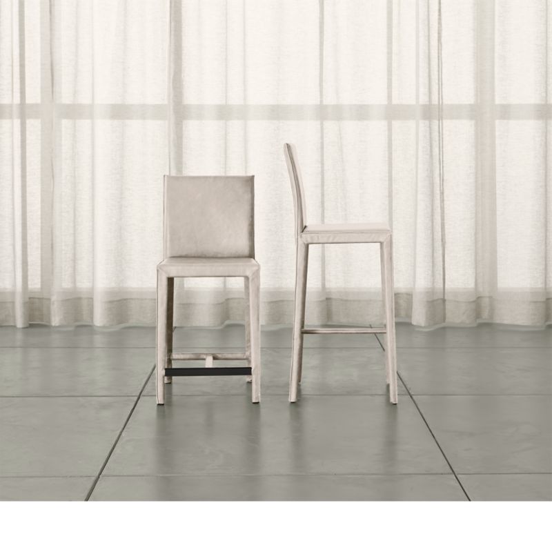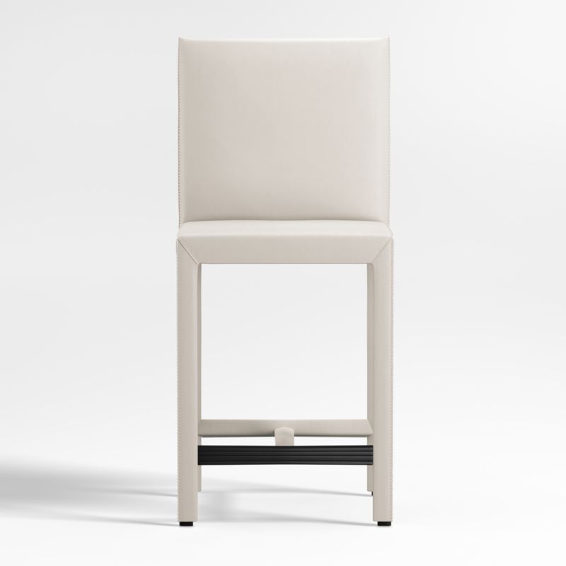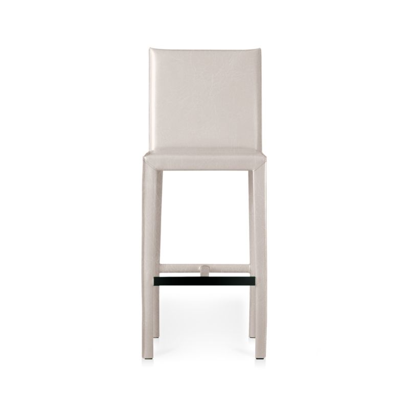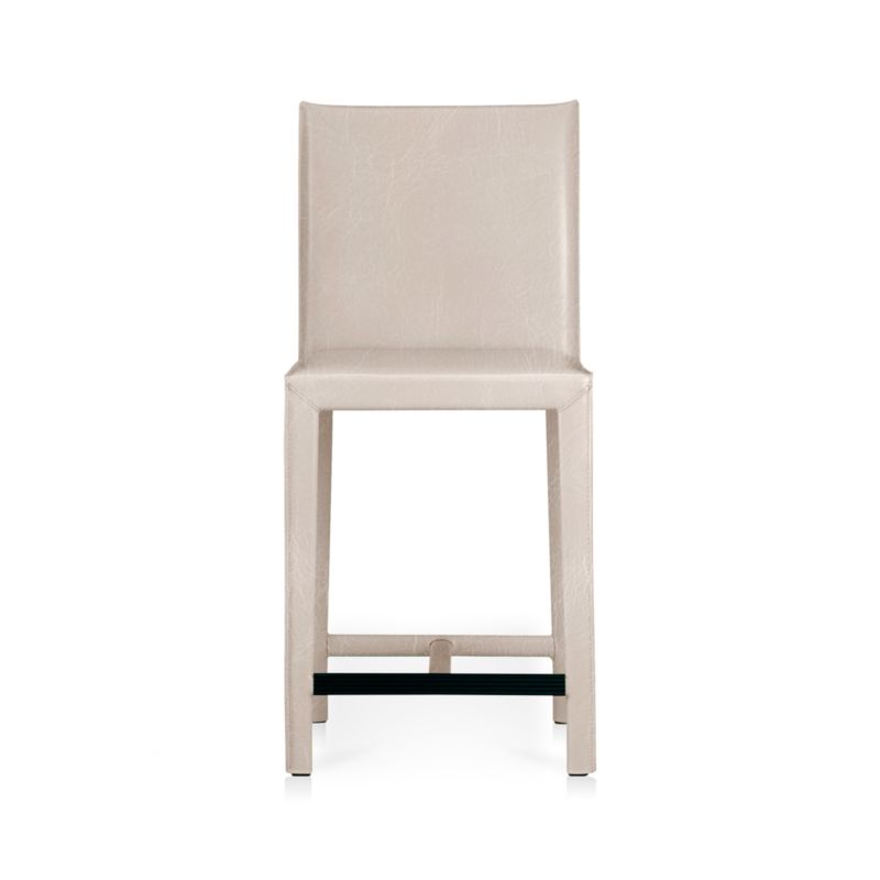 Scaled for counters, high dining tables and workstations, the stool is outfitted with a convenient footrest with a protective cover. The Folio Sand Top-Grain Leather Counter Stool is a Crate and Barrel exclusive.