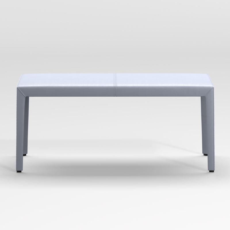 Pull up our Folio bench to the dining table or anywhere that could use some extra seating. Fully wrapped in top-grain leather in slate blue, the bench reinterprets classic Italian design with clean Parsons-style lines and neat mitered corners, flange seaming and stitched construction refine the look. Seating two, the bench has an inviting, foam-cushioned seat. The Folio Top-Grain Leather 40" Bench is a Crate and Barrel exclusive.