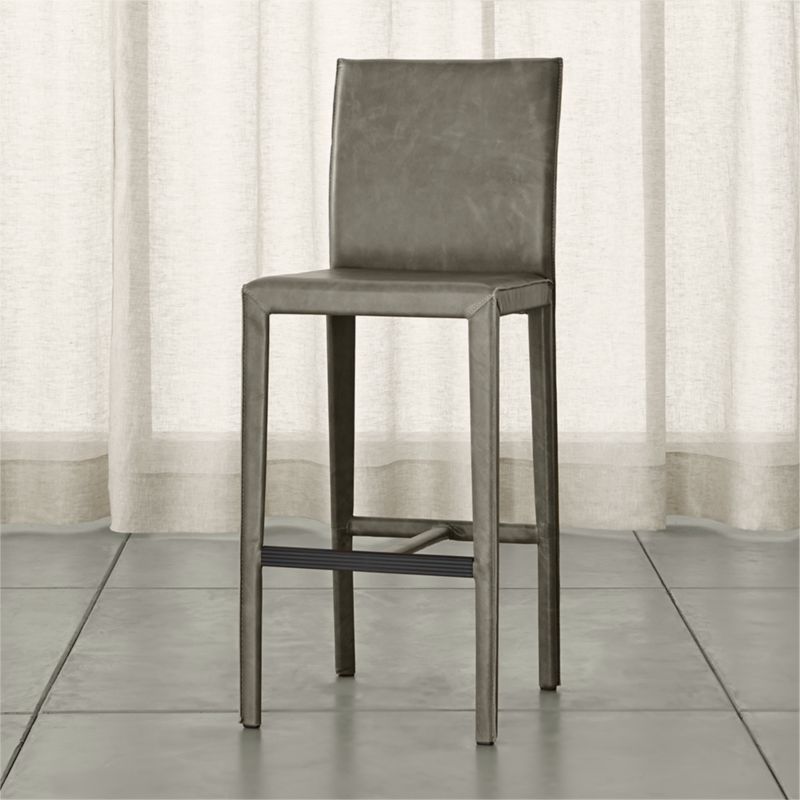High on style yet serious about comfort, the stool invites with a foam-cushioned seat and subtly curved back. A grooved footrest features a protective cover. The Folio Stone Top-Grain Leather Bar Stool is a Crate and Barrel exclusive.