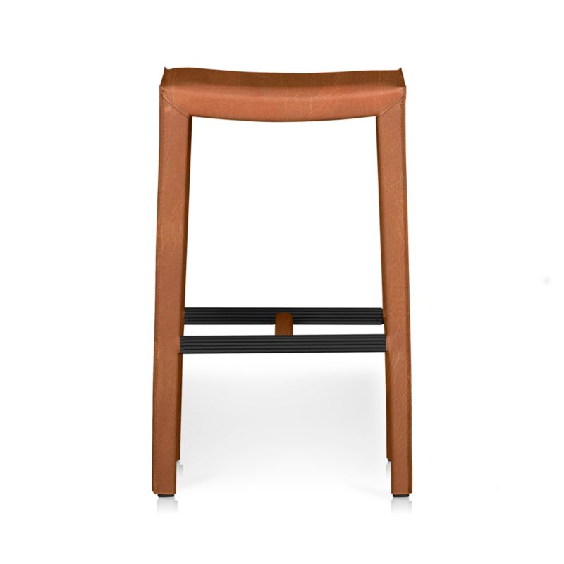 A reinterpretation of classic Italian design with clean Parsons-inspired lines, our convivial Folio backless bar stool is fully wrapped in luxe leather in warm whiskey brown. Finished with neat mitered corners, flange seaming and stitched construction, the stool is high on style yet serious about comfort with a foam-cushioned seat and grooved footrest.