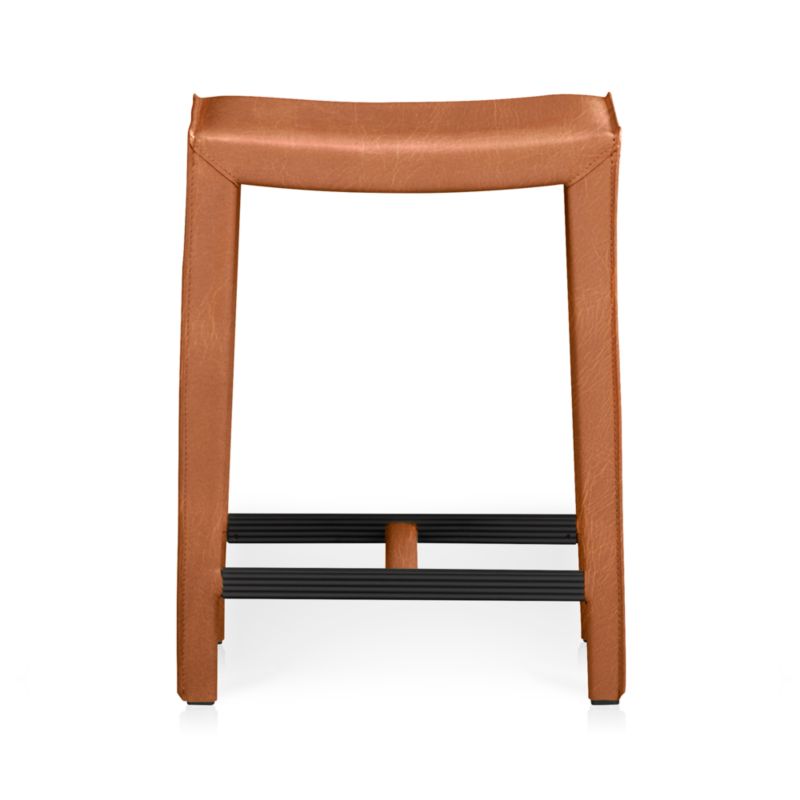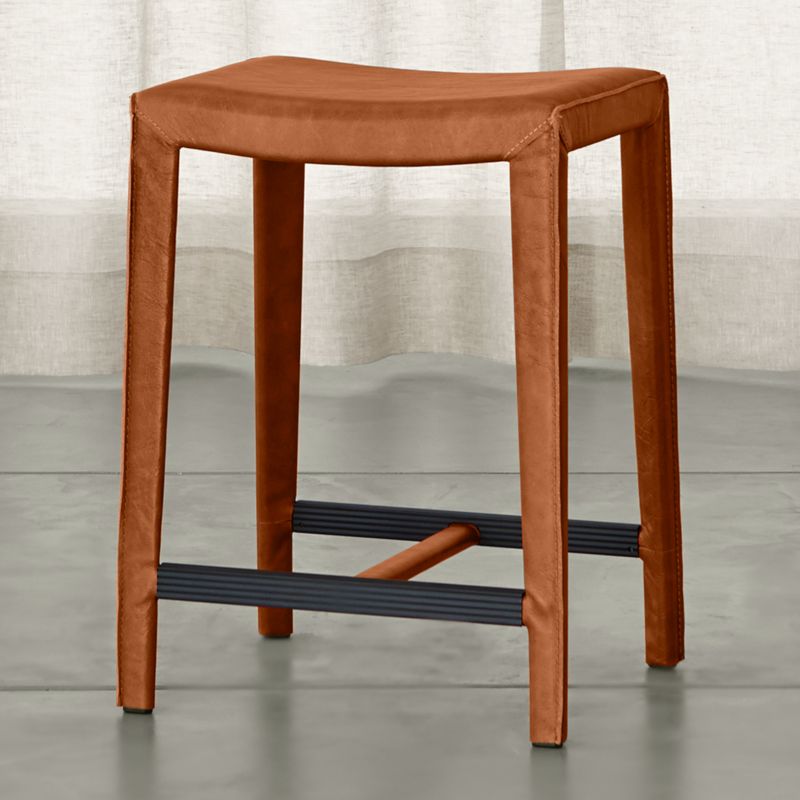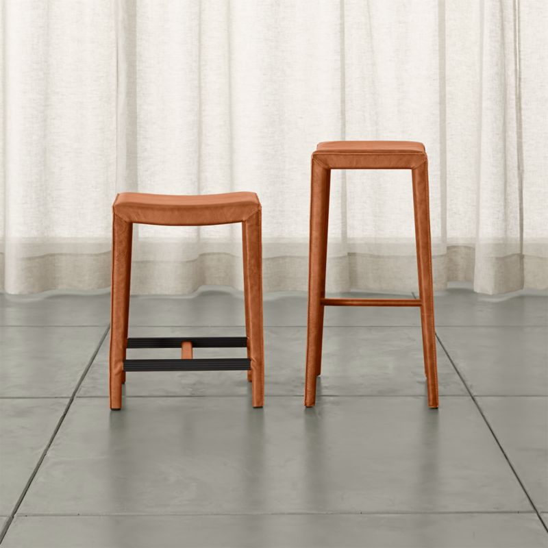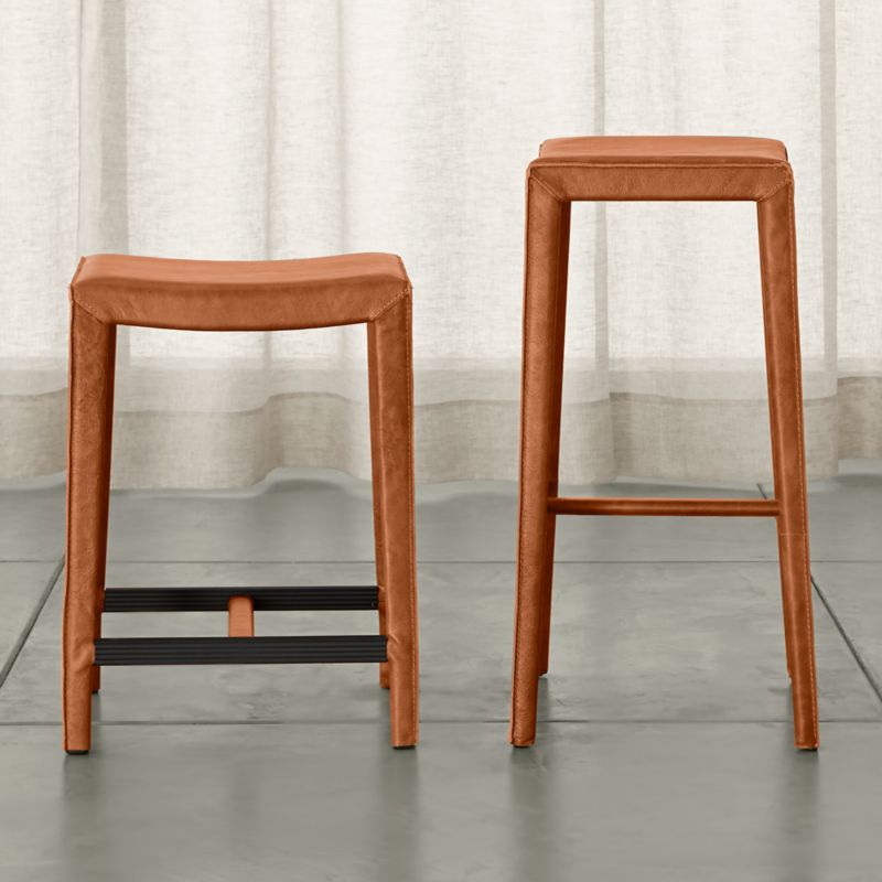 The Folio Whiskey Top-Grain Leather Backless Bar Stool is a Crate and Barrel exclusive.
