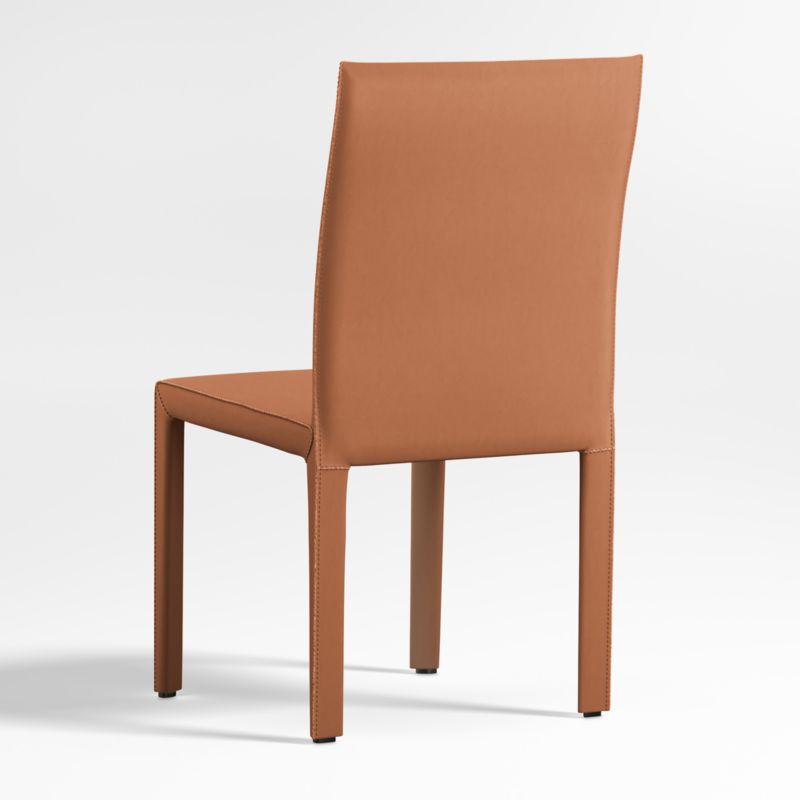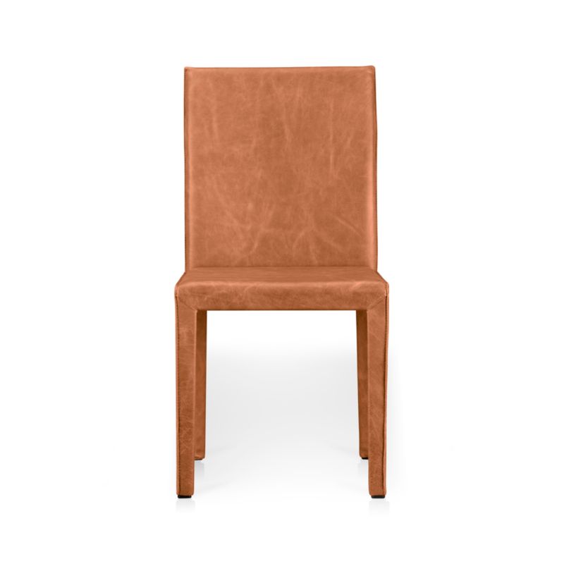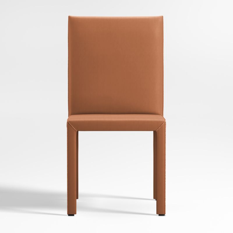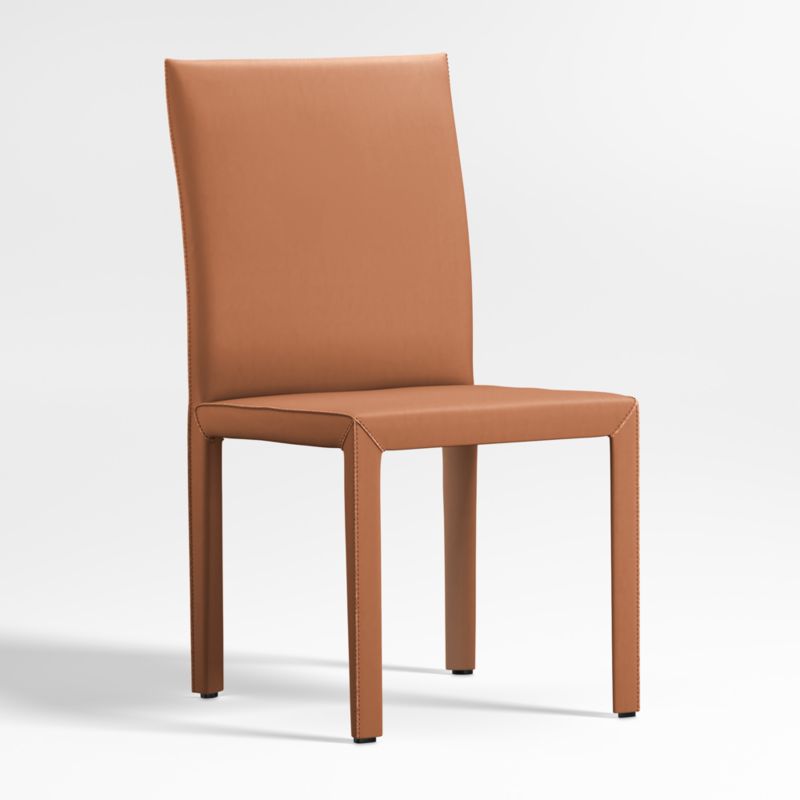 Classic Italian design is reinvented in our luxe whiskey brown side chair, fully wrapped in top-grain, semi-aniline, vegetable-tanned leather and finished with neat mitered corners, flange seaming and stitched construction. Clean Parsons lines with a sturdy, solid steel welded base and comfortable foam-cushioned seat add to the side chair's good looks to make it a customer favorite. The Folio Whiskey Brown Top-Grain Leather Dining Chair is a Crate and Barrel exclusive.