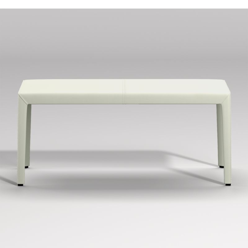 Seating two, the bench has an inviting, foam-cushioned seat. The Folio leather bench is a Crate and Barrel exclusive.