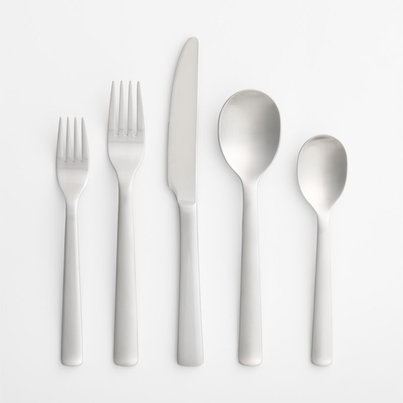 Scandinavian-inspired forms with a clean satin finish. The stainless steel five-piece place setting includes a salad fork, dinner fork, dinner knife, teaspoon and dinner spoon. Designed by Robert Welch exclusively for Crate and Barrel, our Foster flatware is also available in a bright mirror finish.