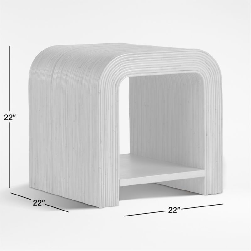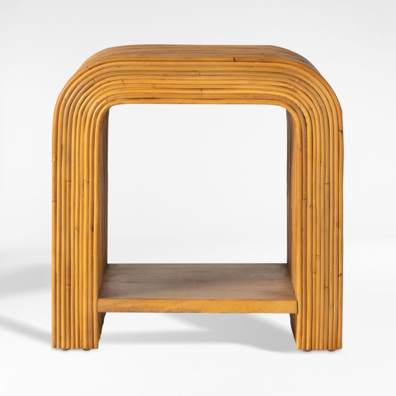 Art Deco curves meet a 1970s-inspired love of rattan in our Frannie end table. Rattan stems line up side by side to curve the table's bold waterfall silhouette for a geo look that feels retro yet right on time. Made of renewable mango wood from trees no longer producing fruit, a single shelf spans the arch to store books or a basket full of living room essentials.