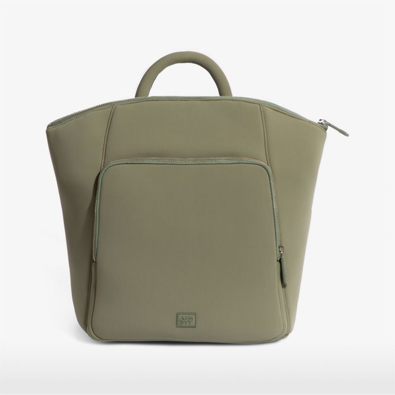 A diaper bag that suits your style. Constructed of on-trend neoprene in sage green, this backpack accommodates all of the essentials while complementing all of your looks. Metal feet protect the bottom of the bag to keep it looking its best, and the convertible cushioned straps allow for hands-free crossbody and backpack wear. The tote boasts a total of 11 pockets, plus a coordinating changing mat and a key ring that eliminates the dreaded digging around. Water-resistant, lightweight and chicly minimalist, this athleisure-inspired diaper bag makes a lovely shower gift for the expecting fashionista.