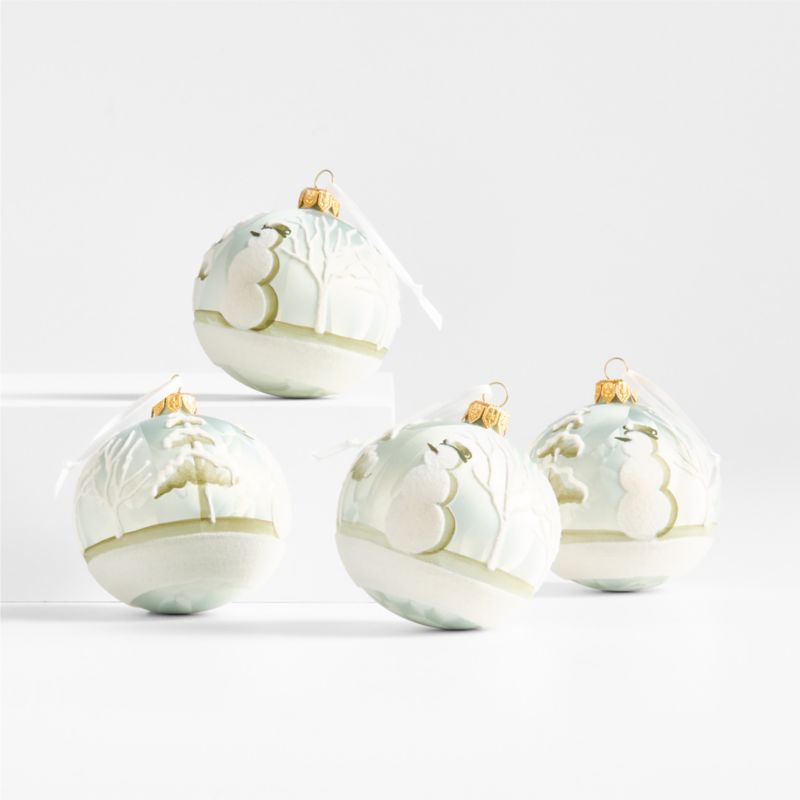 These painterly ornaments bring the serene wonder of the winter landscape indoors. Talented artisans craft each one by hand, blowing glass into spheres and adorning each one with a peaceful, frosty scene. Painted in a subtle palette of whites and greens, a dapper snowman stands proudly amid snow drifts and frosted trees. Gleaming gold caps and snow-white ribbons complete our exclusive set of four Christmas tree ornaments.