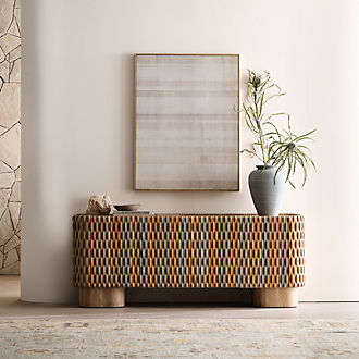 Media storage furniture like TV stands brings stylish organization to your space. From books and DVDs to decorative vases and sculptures, our modern media consoles allow you to showcase favorite decor items while storing away cords, remotes and game consoles. In living rooms, family rooms, home offices and even bedrooms, find media furniture that complements existing pieces, such as popular types of sofas and accent chairs like those from the Gather collection. Read on to learn more about how to choose an entertainment center, media console or TV stand.