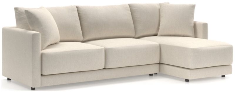 Striking the perfect balance between maximum comfort and modern style, our Gather sectional sofa is clean-lined and current. Boxy, extra-plush seat cushions have inner-coil construction for maximum comfort and durability. Fiber-filled back cushions settle you in for the ultimate lounge.