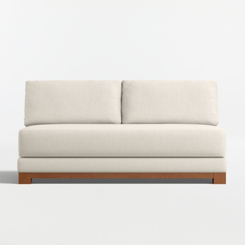 Striking the perfect balance between comfort and modern style, our Gather Petite sectional seating is clean-lined, current and scaled to suit small spaces. Anchored by a natural wood base, the armless sofa welcomes you with boxy, extra-plush seat cushions designed with inner-coil construction for maximum comfort and durability. Trim top-stitching keeps the look neat, not fussy. The Gather Petite wood-base armless sofa is a Crate & Barrel exclusive.