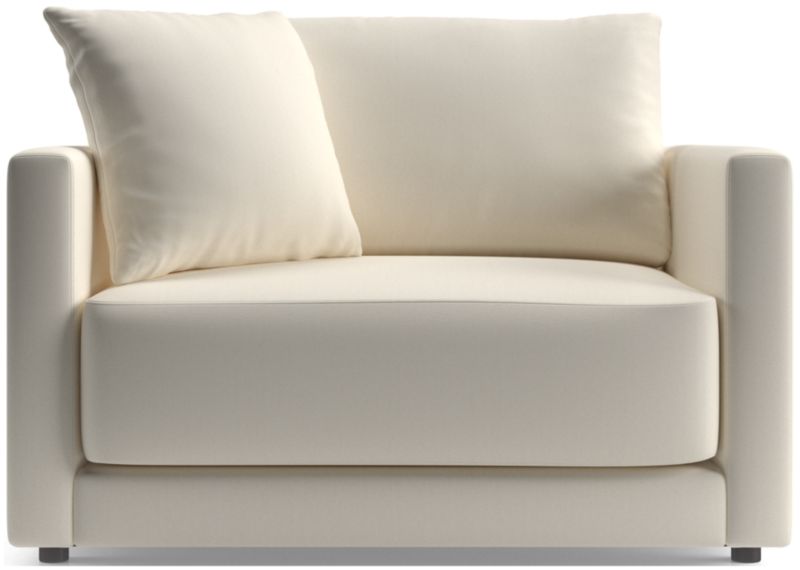 Trim top-stitching and seamless armrests keep the look neat, not fussy. An exclusive Crate and Barrel design, the petite Gather chair and half is made with engineered wood certified by the Forest Stewardship Council (FSC ®), the environmental gold standard for responsibly managed forests.