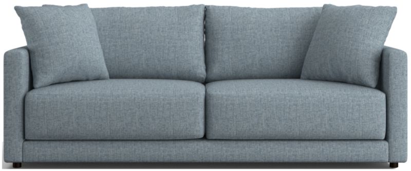 Everyone's invited to Gather. Clean-lined and current, our Gather sofa strikes the perfect balance between comfort and modern style. Scaled for smaller living spaces, the Gather sofa breaks new ground with a thin deck that puts all the focus on its boxy, extra-plush seat cushions that sit comfy but not too deep. Trim top-stitching and seamless armrests keep the look neat, not fussy. An exclusive Crate and Barrel design, the Gather sofa is made with engineered wood certified by the Forest Stewardship Council (FSC ®), the environmental gold standard for responsibly managed forests.