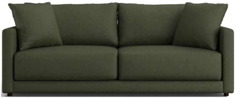 Everyone's invited to Gather. Clean-lined and current, our Gather sofa strikes the perfect balance between comfort and modern style. Scaled for smaller living spaces, the Gather sofa breaks new ground with a thin deck that puts all the focus on its boxy, extra-plush seat cushions that sit comfy but not too deep. Trim top-stitching and seamless armrests keep the look neat, not fussy. An exclusive Crate and Barrel design, the Gather sofa is made with engineered wood certified by the Forest Stewardship Council (FSC ®), the environmental gold standard for responsibly managed forests.