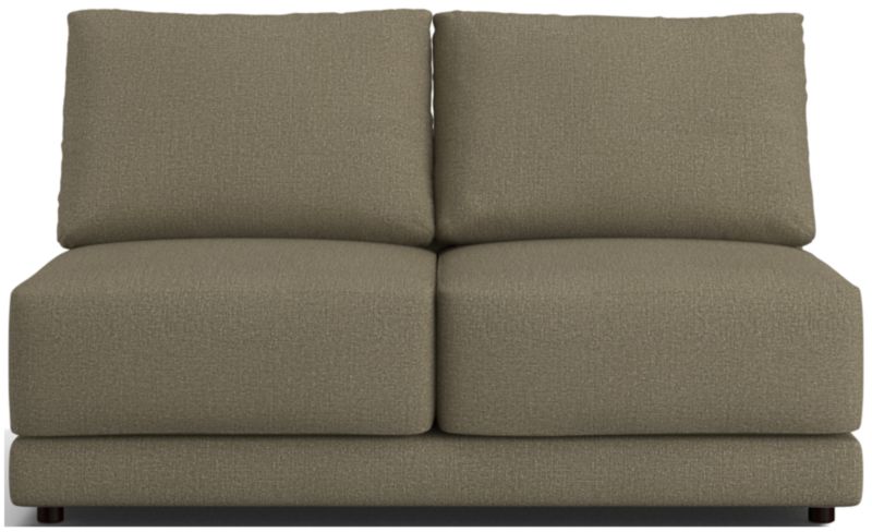 Everyone's invited to Gather. Clean-lined and current, our Gather sectional seating strikes the perfect balance between comfort and modern style. The armless loveseat breaks new ground with a thin deck that puts all the focus on its boxy, extra-plush seat cushions. Trim top-stitching adds to the loveseat's neat yet never fussy look. An exclusive Crate and Barrel design, the Gather armless loveseat is made with engineered wood certified by the Forest Stewardship Council (FSC ®), the environmental gold standard for responsibly managed forests.