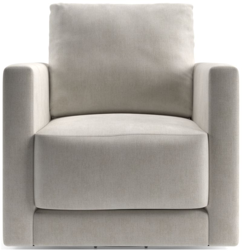 To create this smaller version of our popular Gather swivel chair, we've made the seat a little less deep and a little bit narrower for a cozier sit. A boxy, extra-plush seat cushion made with inner-coil construction is soft, supportive while the fiber-filled back cushion settles you in for the ultimate lounge, while the 360-degree swivel gives you a sweeping view of the room.