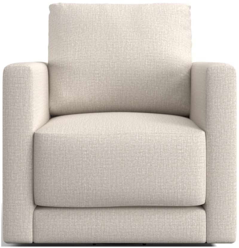 To create this smaller version of our popular Gather swivel chair, we've made the seat a little less deep and a little bit narrower for a cozier sit. A boxy, extra-plush seat cushion made with inner-coil construction is soft, supportive while the fiber-filled back cushion settles you in for the ultimate lounge, while the 360-degree swivel gives you a sweeping view of the room.