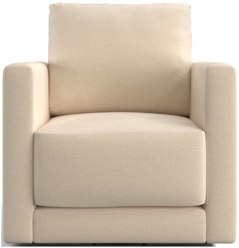 To create this smaller version of our popular Gather swivel chair, we've made the seat a little less deep and a little bit narrower for a cozier sit. A boxy, extra-plush seat cushion made with inner-coil construction is soft, supportive while the fiber-filled back cushion settles you in for the ultimate lounge, while the 360-degree swivel gives you a sweeping view of the room.