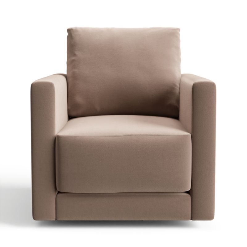 To create this smaller version of our popular Gather swivel chair, we've made the seat a little less deep and a little bit narrower for a cozier sit. A boxy, extra-plush seat cushion made with inner-coil construction is soft, supportive while the fiber-filled back cushion settles you in for the ultimate lounge, while the 360-degree swivel gives you a sweeping view of the room.