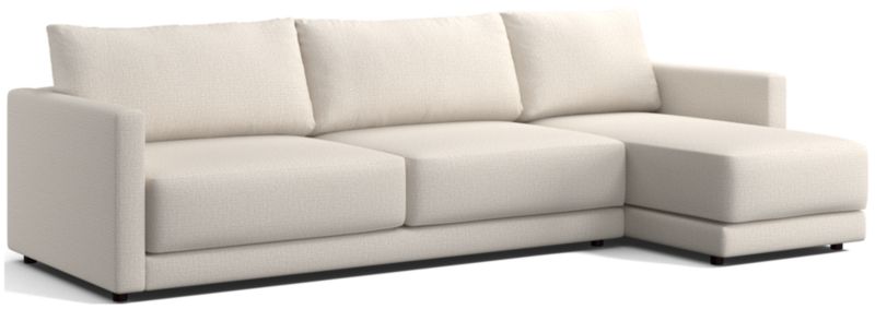 Striking the perfect balance between maximum comfort and modern style, our Gather sectional sofa is clean-lined and current. Deep-seated cushions are boxy and extra-plush made with inner-coil construction for maximum comfort and durability. Fiber-filled back cushions settle you in for the ultimate lounge.