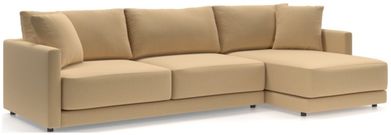 Striking the perfect balance between maximum comfort and modern style, our Gather sectional sofa is clean-lined and current. Deep-seated cushions are boxy and extra-plush made with inner-coil construction for maximum comfort and durability. Fiber-filled back cushions settle you in for the ultimate lounge.