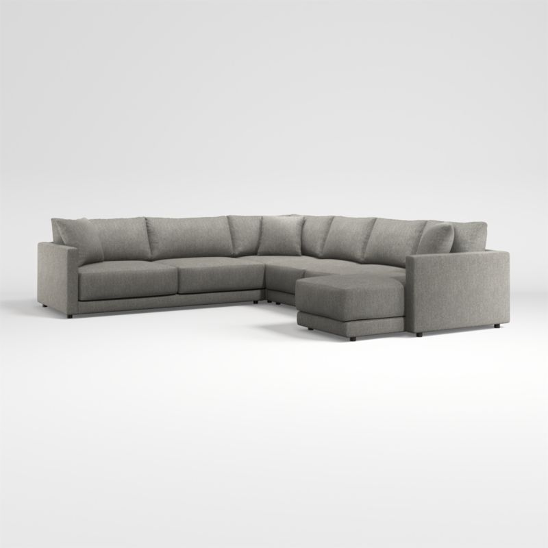 Clean-lined and current, our Gather sectional seating strikes the perfect balance between comfort and modern style. The four-piece sectional brings together a right-arm chaise, armless loveseat, left-arm sofa and a corner. Featuring thin decks that put all the focus on the boxy, extra-plush seat cushions, the sectional is tailored with trim top-stitching and seamless armrests that keep the look neat, not fussy.