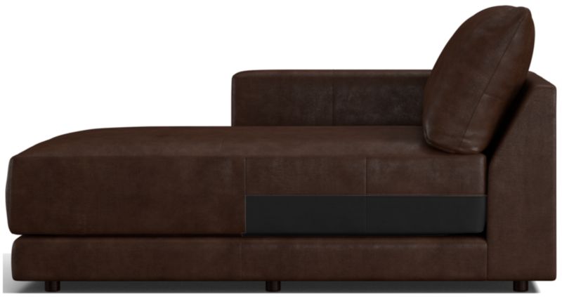 Clean-lined and current, our Gather sectional components are covered in buttery Italian-made leather. Similar to that used in high-end handbags and apparel, the leather is tanned, buffed and ironed to create a silky surface that's supple, rich and luxurious to the touch. Striking the perfect balance between comfort and modern style, the left-arm chaise breaks new ground with a thin deck that puts all the focus on its boxy, extra-plush seat cushions. Trim top-stitching and supple Italian leather keep the look neat, not fussy. An exclusive Crate and Barrel design, the Gather left-arm chaise is made with engineered wood certified by the Forest Stewardship Council FSC r, the environmental gold standard for responsibly managed forests.