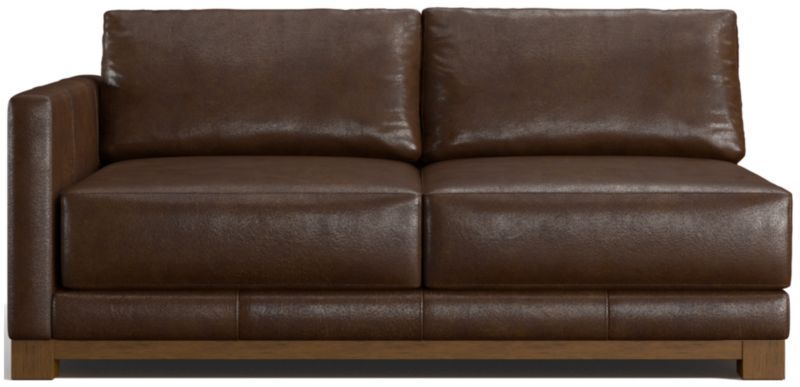 Everyone's invited to Gather. Clean-lined and current, our Gather sectional collection strikes the perfect balance between comfort and modern style. Anchored by a natural wood base, the deep-seated left-arm sofa welcomes you with extra-plush seat cushions designed with inner-coil construction for maximum comfort and durability. Rich with natural markings and subtle color variations , the exquisite leather upholstery lends a dramatic look, supersmooth feel and high-sheen finish that makes Gather glow. Trim topstitching and a knife-tailored throw pillow keep the look neat, not fussy. Combine the left-arm sofa with other components to create a sectional to suit your space.