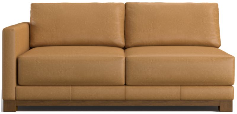 Everyone's invited to Gather. Clean-lined and current, our Gather sectional collection strikes the perfect balance between comfort and modern style. Anchored by a natural wood base, the deep-seated left-arm sofa welcomes you with extra-plush seat cushions designed with inner-coil construction for maximum comfort and durability. Rich with natural markings and subtle color variations , the exquisite leather upholstery lends a dramatic look, supersmooth feel and high-sheen finish that makes Gather glow. Trim topstitching and a knife-tailored throw pillow keep the look neat, not fussy. Combine the left-arm sofa with other components to create a sectional to suit your space.
