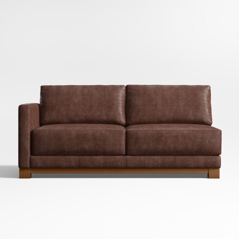 Everyone's invited to Gather. Clean-lined and current, our Gather sectional collection strikes the perfect balance between comfort and modern style. Anchored by a natural wood base, the deep-seated left-arm sofa welcomes you with extra-plush seat cushions designed with inner-coil construction for maximum comfort and durability. Rich with natural markings and subtle color variations , the exquisite leather upholstery lends a dramatic look, supersmooth feel and high-sheen finish that makes Gather glow. Trim topstitching and a knife-tailored throw pillow keep the look neat, not fussy. Combine the left-arm sofa with other components to create a sectional to suit your space.