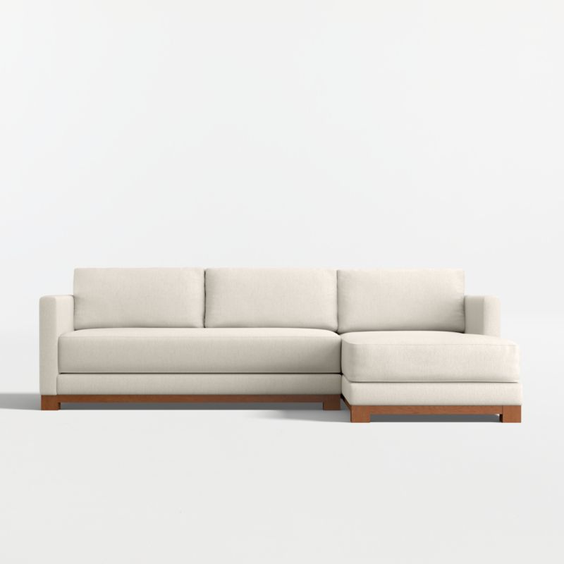 Striking the perfect balance between maximum comfort and modern style, our Gather sectional sofa is clean-lined and current. Anchored by a wood base, the sectional features boxy, extra-plush seat cushions made with inner-coil construction for maximum comfort and durability. Fiber-filled back cushions settle you in for the ultimate lounge.