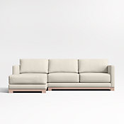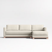 Striking the perfect balance between comfort and modern style, our Gather Petite sectional sofa is clean-lined, current and scaled to suit small spaces. Anchored by a natural wood base, the left-arm chaise and right-arm sofa welcome you with boxy, extra-plush seat cushions designed with inner-coil construction for maximum comfort and durability. Trim top-stitching keeps the look neat, not fussy. The Gather Petite two-piece sectional with wood base is a Crate & Barrel exclusive.