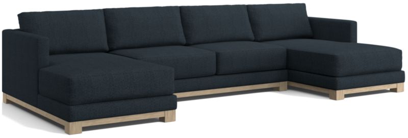 Striking the perfect balance between comfort and modern style, our Gather Petite sectional sofa is clean-lined, current and scaled to suit small spaces. Anchored by a natural wood base, each piece in the U-shaped sectional welcomes you with boxy, extra-plush seat cushions designed with inner-coil construction for maximum comfort and durability. Composed of right- and left-arm chaises and an armless sofa, the three-piece sectional features trim top-stitching to keep the look neat. The Gather Petite sectional sofa with wood base is a Crate & Barrel exclusive.